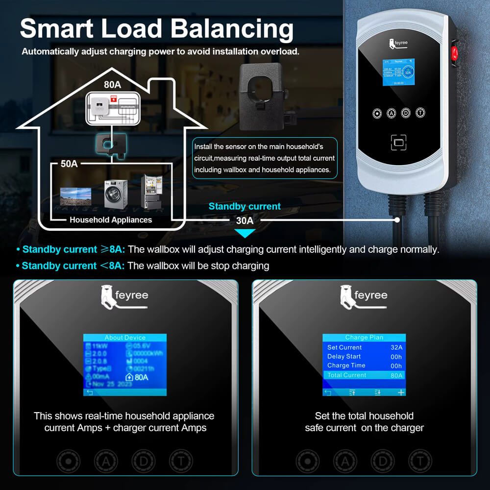 - Dinamikus Terheléselosztó Funkció (DLB): Intelligens teljesítményszabályozás, nem kell aggódnia az elektromos rendszer túlterhelése miatt, mivel a töltő automatikusan figyeli a háztartási készülékek áramfogyasztását, és ennek megfelelően állítja be a töltőáramot.